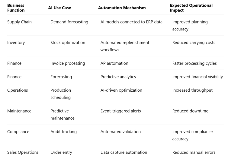 AI-powered automation introduces a complementary layer that changes this dynamic. It enables ERP environments to move from passive systems of record to active systems that support, guide, and in certain cases execute operational decisions.